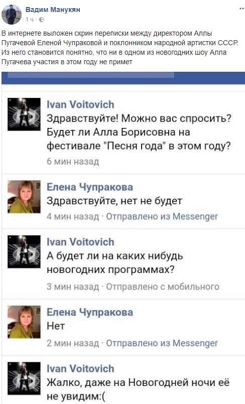 Сегодня в Сети появилась ее переписка с поклонником Пугачевой, который интересовался, где можно увидеть любимую певицу в новогоднюю ночь.