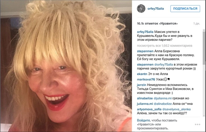 На одном из фото она сфотографировалась в парике блондинки. «Максик улетел в Куршавель. Куда бы и мне рвануть в этом игривом паричке?», — спросила певица у подписчиков. Пугачева публикует в Instagram и короткие видеоролики. Особый восторг у поклонников вызвали детские фотографии певицы.