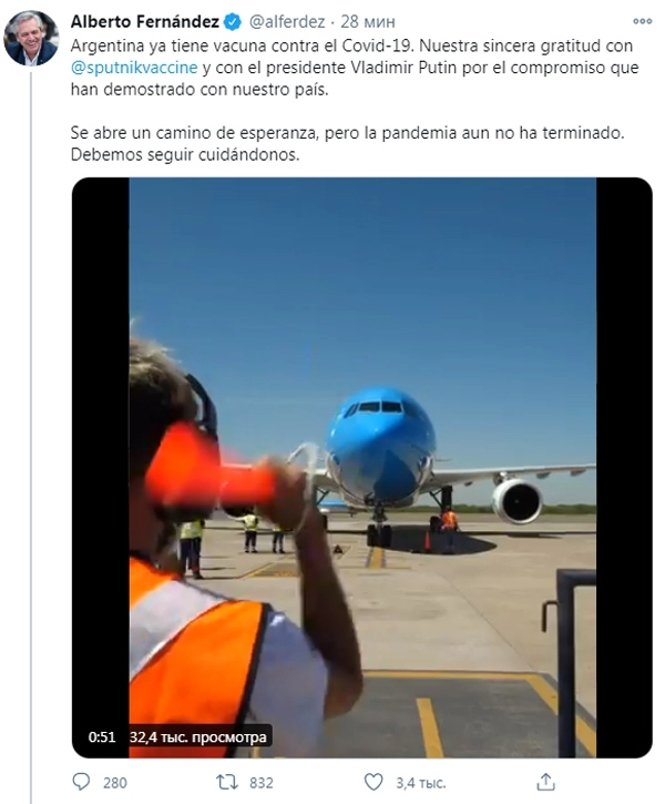 «В Аргентине уже есть вакцина против COVID-19», — написал аргентинский лидер в Twitter, добавив к посту видеозапись встречи самолета с препаратом.