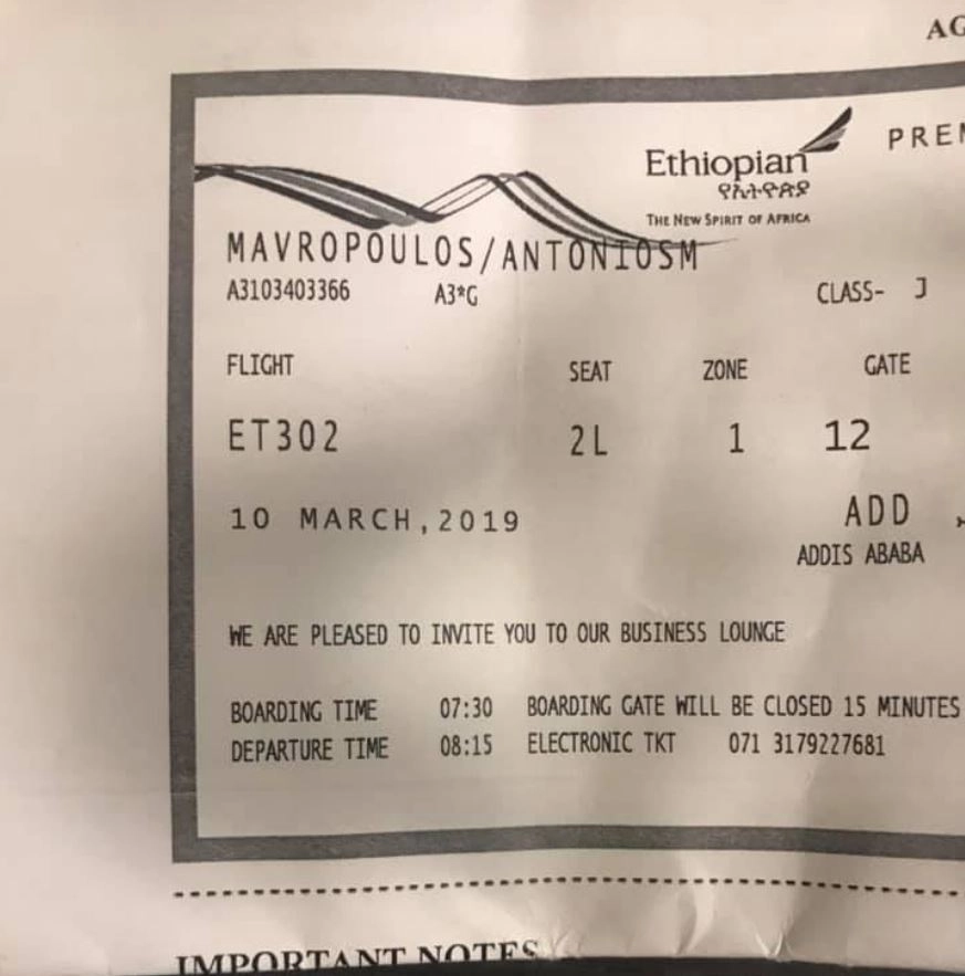 Путешественник из Греции Антониос Мавропулос спасся от неминуемой гибели, опоздав на потерпевший крушение утром 10 марта пассажирский «Боинг 737» авиакомпании Ethiopian Airlines, следовавший рейсом ET302 из Аддис-Абебы в Найроби.