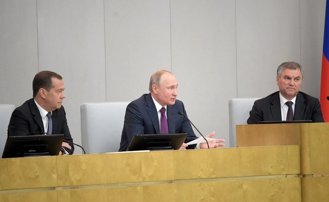 Перед началом пленарного заседания в Госдуме. Дмитрий Медведев (слева), президент Владимир Путин (в центре) и спикер ГД Вячеслав Володин. © Kremlin
