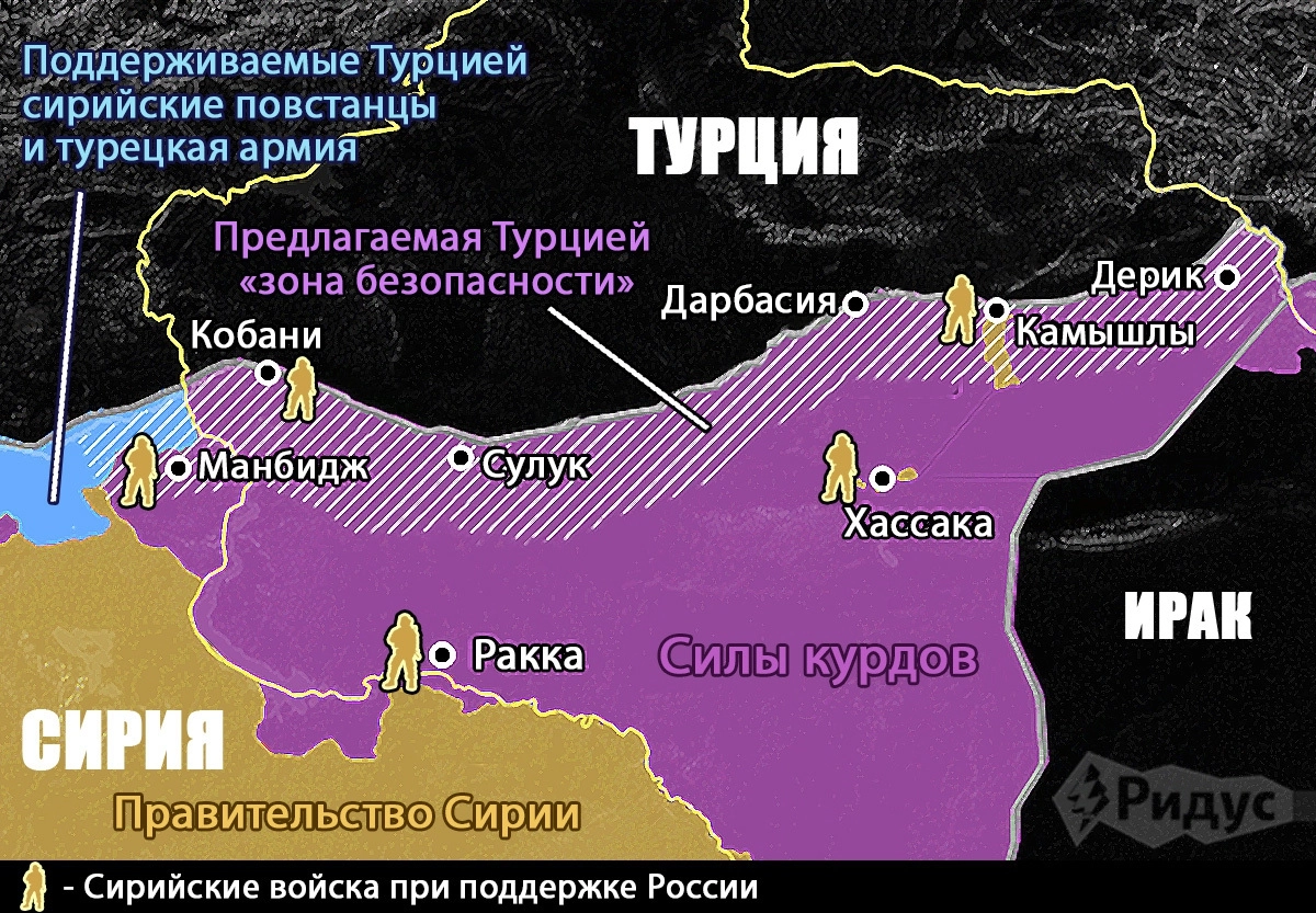В тот же момент во взаимоотношения между попавшими под удар курдами и президентом Сирии Башаром Асадом вмешалась Россия, взявшая на себя роль посредника. Это привело к появлению российско-сирийского военного альянса, войска которого выдвинулись навстречу турецким и быстро заняли важные стратегические объекты на севере Сирии, только что оставленные американцами. Сегодня они патрулируют новую линию соприкосновения между армией Асада и турецкой армией. Эрдоган поспешил заявить, что не возражает против войск альянса на линии соприкосновения. Его интересует лишь, чтобы в «зоне безопасности» не оставалось курдов.