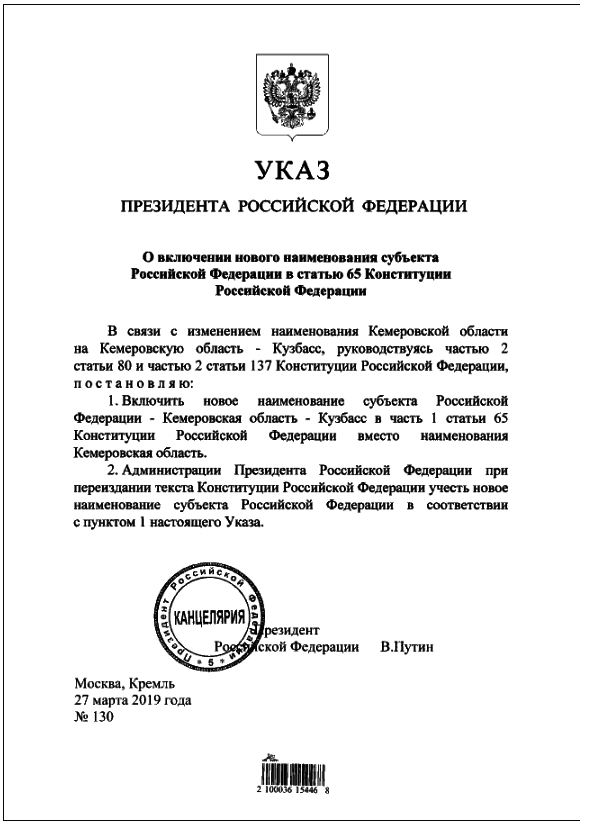 Президент России Владимир Путин утвердил новое официальное название для Кемеровской области. Регион получил двойное наименование Кемеровская область — Кузбасс.