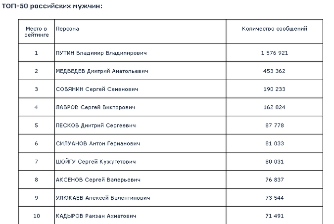 На третьем месте находится мэр Москвы Сергей Собянин — 190 тыс. раз, за ним идет глава МИД РФ Сергей Лавров (162 тыс.). Пятерку лидеров замыкает пресс-секретарь главы государства Дмитрий Песков — почти 88 тысяч упоминаний в СМИ за год.