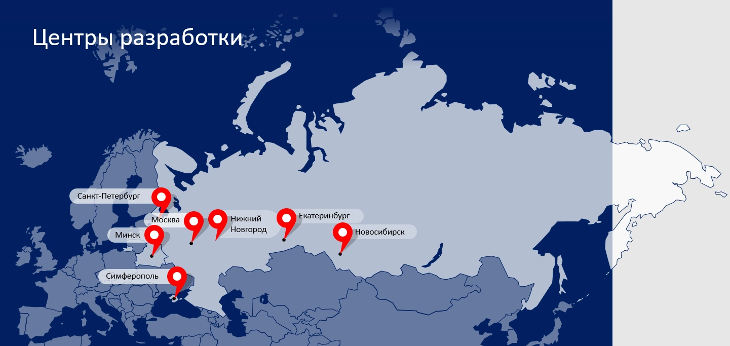 Прибыв в офис, президент первым делом изучил огромную карту РФ и ближнего зарубежья с отмеченными на ней городами, где у компании есть офисы разработки. Это Москва, Санкт-Петербург, Нижний Новгород, Екатеринбург, Новосибирск, Симферополь и Минск.