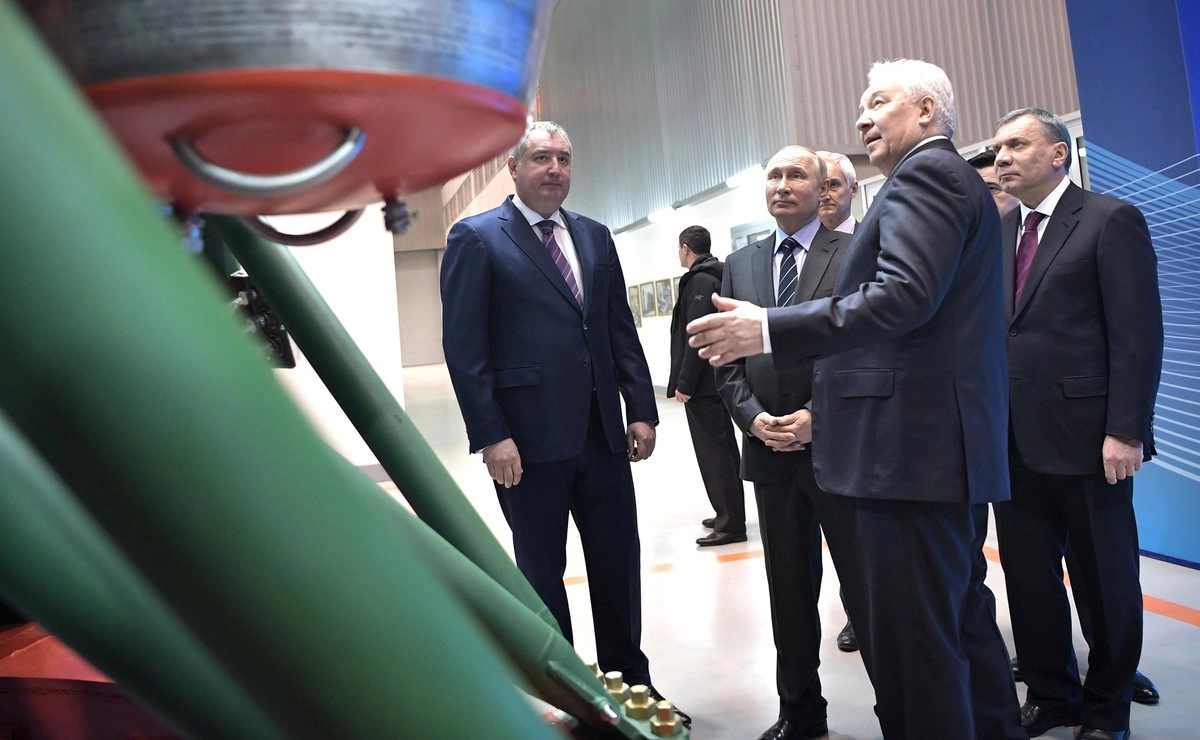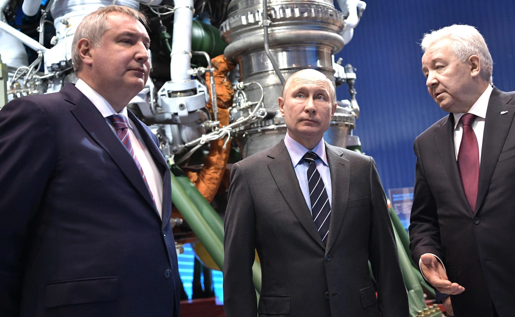 Глава «Роскосмоса» Дмитрий Рогозин (слева), Владимир Путин и генеральный директор «НПО Энергомаш» Игорь Арбузов.