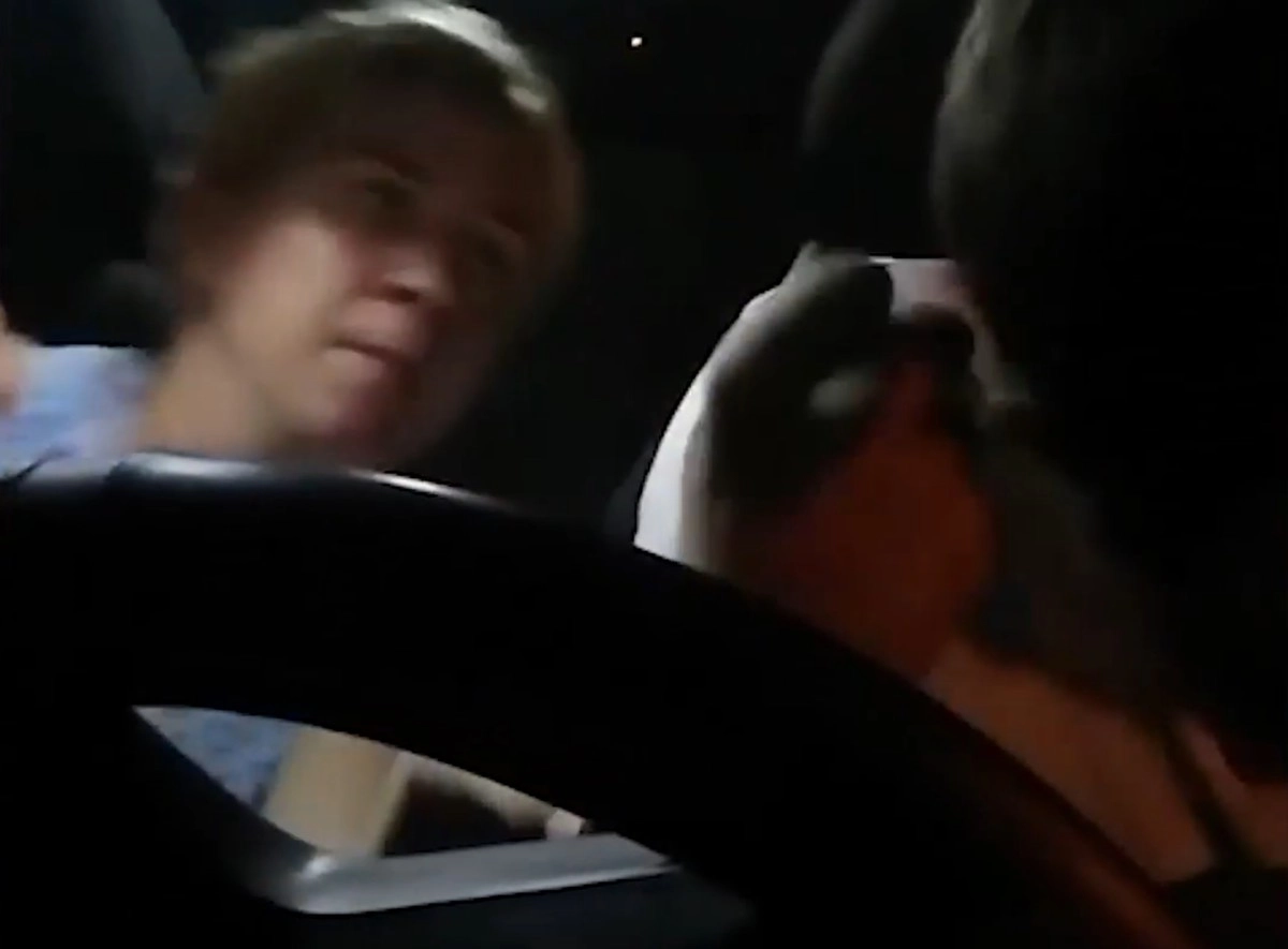Затем она выходит из себя и начинает избивать таксиста кулаками и таскать его за волосы. За кадром слышно, как какой-то мужчина просит ее выйти из автомобиля и успокоиться, однако она продолжает бить и оскорблять водителя.
