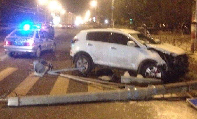 Активист не успел дозвонится до экстренной службы как неожиданно для него пьяный полицейский врезается в светофор, сбивая при этом дорожный знак и опору линии электропередачи.