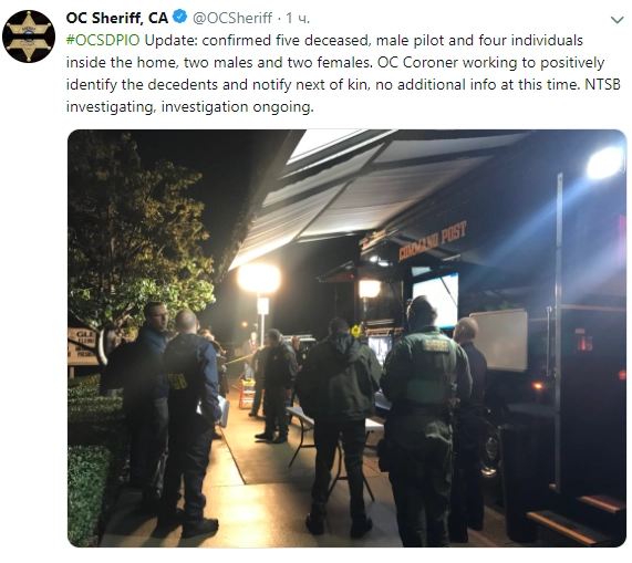 В результате происшествия погибли пять человек: пилот, а также две женщины и двое мужчин, находившиеся в доме, сообщается в микроблоге управления шерифа округа Ориндж в Twitter.