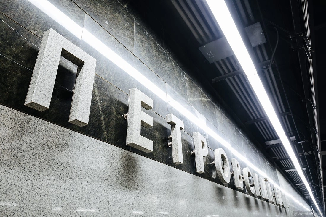 Начнем с «Петровского парка». С окончанием строительства этой станции для движения транспорта полностью откроют Театральную аллею, которая ранее была занята стройплощадкой. Несколько странный кернинг в написании.