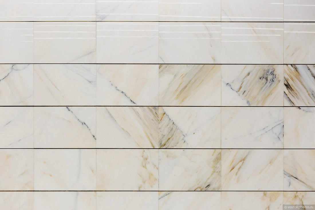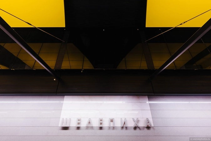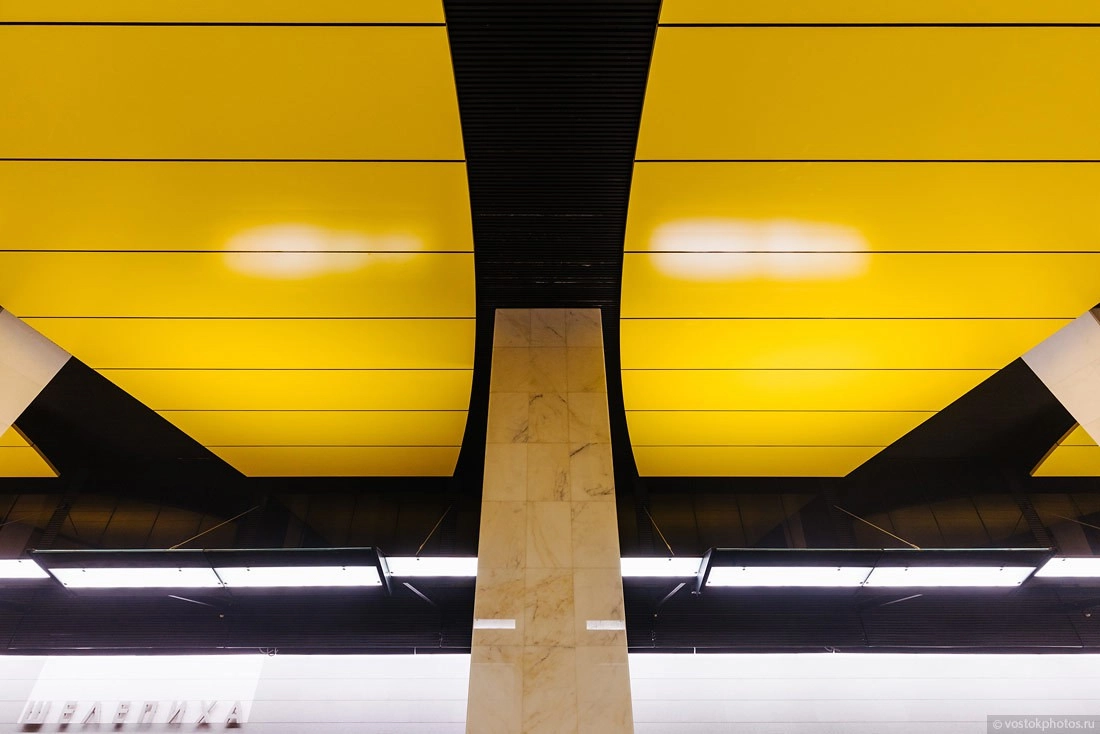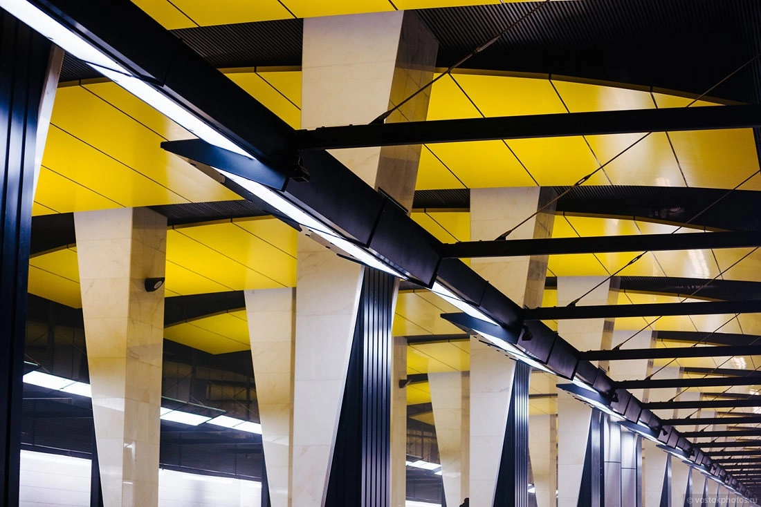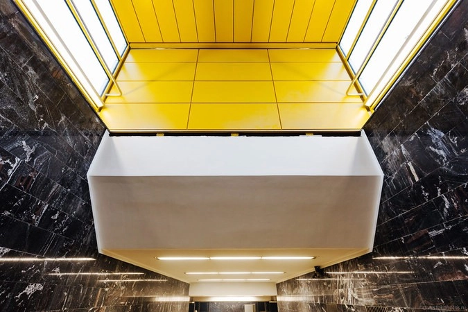 Доминирующими цветами в отделке станции являются белый, желтый и черный.