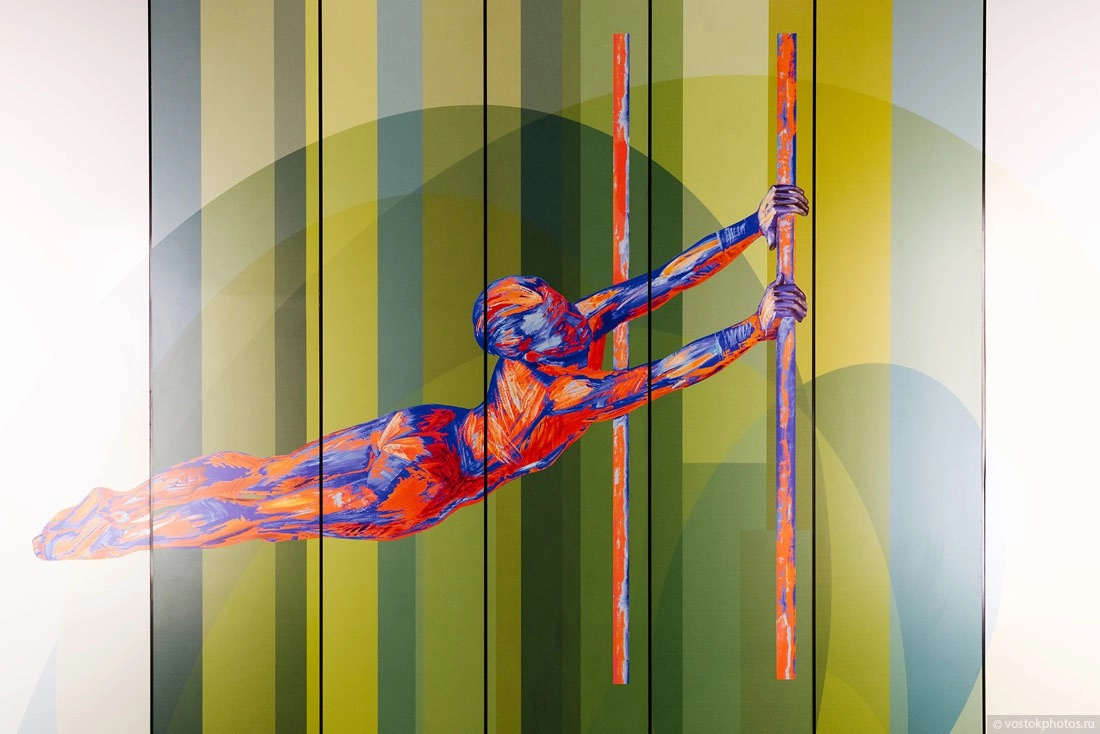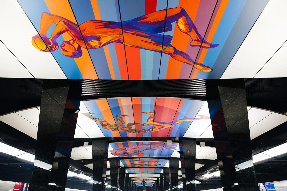 На потолок нанесены декоративные изображения, посвященные различным видам спорта.