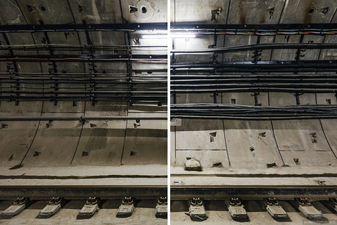 Легкие курильщика и здорового человека. По одной стене тоннеля идет «низкая сторона» с напряжением 220 и 127 В, путейские ящики для обслуживающего персонала с розетками для всяких болгарок, автоматическая телемеханика движения поездов, водопровод, оптоволокно, система звукового оповещения.