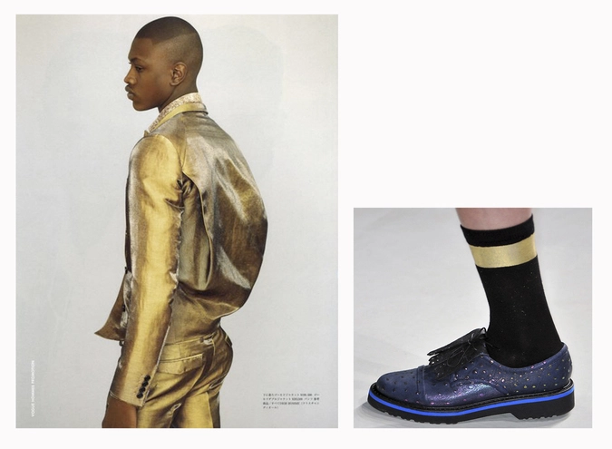 - Металлизированные ткани, ткани с металлическим отливом, станут прекрасной одеждой для праздников. Чувствуется влияние Майкла Джексона, Ройшн Мёрфи в клипе sing it back. С металлическим эффектом может быть всё, вплоть до обуви. Герой праздничной коллекции – «Space cowboy», отсюда вдохновение дискоболлом, мерцание голограммы, шуршание парчи.