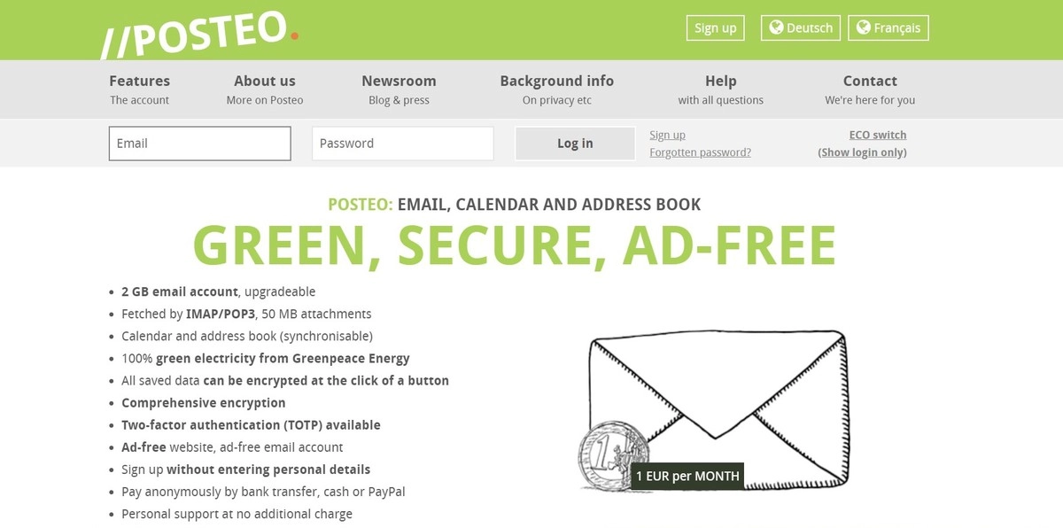 5. Posteo. Posteo — это зашифрованный почтовый сервис на немецком языке. Сервис имеет различные пакеты. За базовый пакет клиентам придется платить 1Euro в месяц. Этот базовый пакет включает в себя доступ к некоторым из наиболее важных функций сервиса, таких как поддержка POP3 и IMAP.