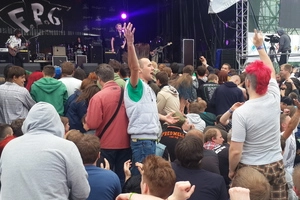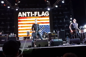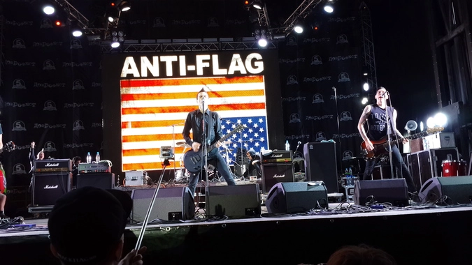 Герои дня, конечно, Anti-Flag: очень лихо отыграли, разбили барабанную установку, вместо микрофона попели в мегафон, выступление завершили выходом к зрителям, предварительно переместив на танцпол установку. Тот, кто знаком с тематикой их текстов и манерой выступлений, догадывается, что американцы в перерывах между песнями говорили слова, призывающие не верить государствам и их медиа-политике. Вот наиболее значимые отрывки из речи фронтмена: