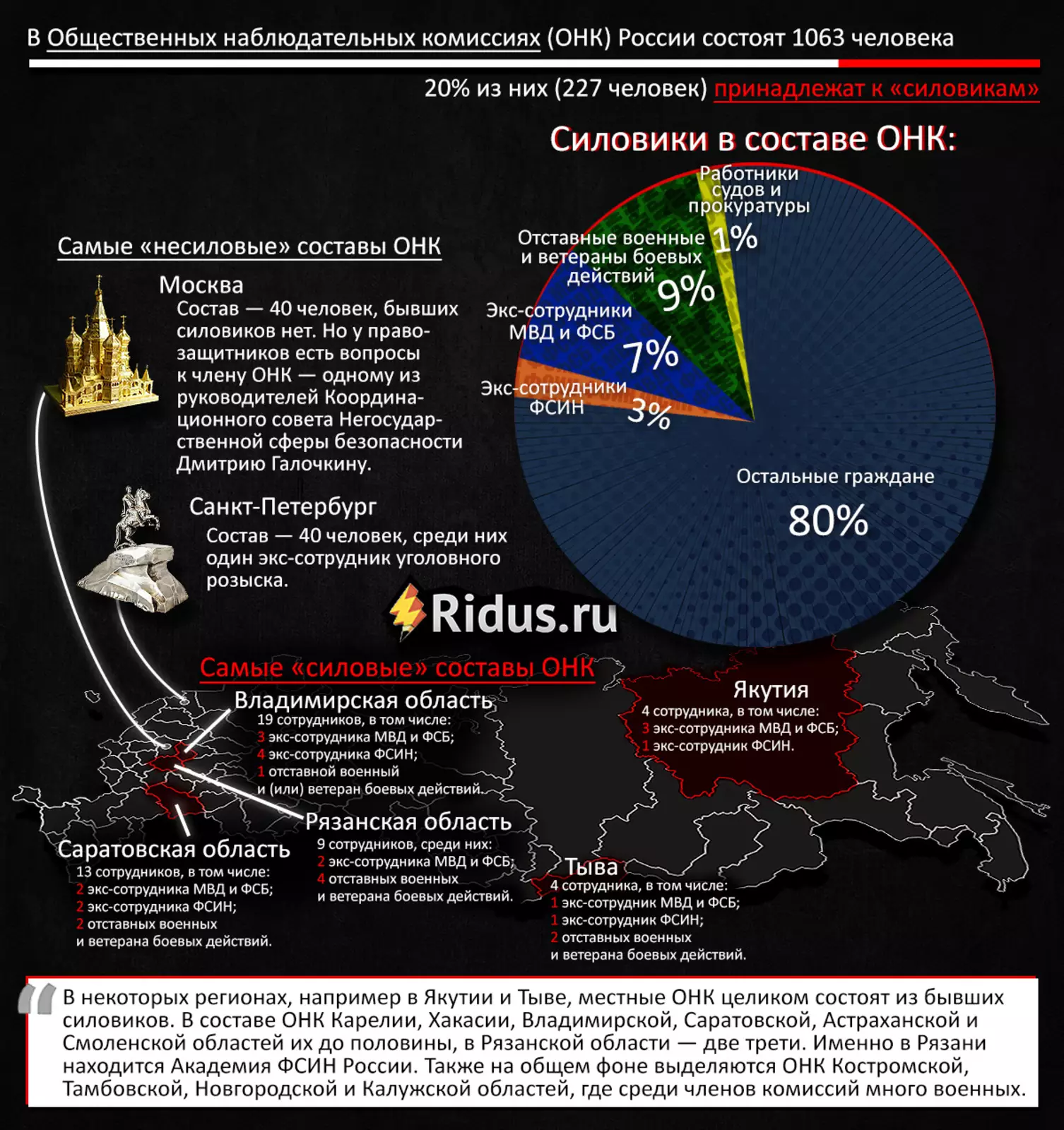Редакция «Ридуса» изучила биографии более тысячи действующих членов региональных ОНК во всех регионах России и обнаружила там в среднем не менее 20% бывших силовиков — это сотрудники ФСИН, МВД, ФСБ, МЧС, бывшие военные, работники судов и прокуратуры.
