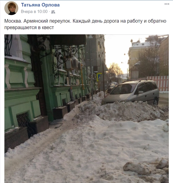Проблемы не только на окраинах, но и в самом центре столицы. Так, тротуары в Армянском переулке вообще ни разу не чистились с 4 февраля и в настоящее время передвижение пешком там опасно для жизни.