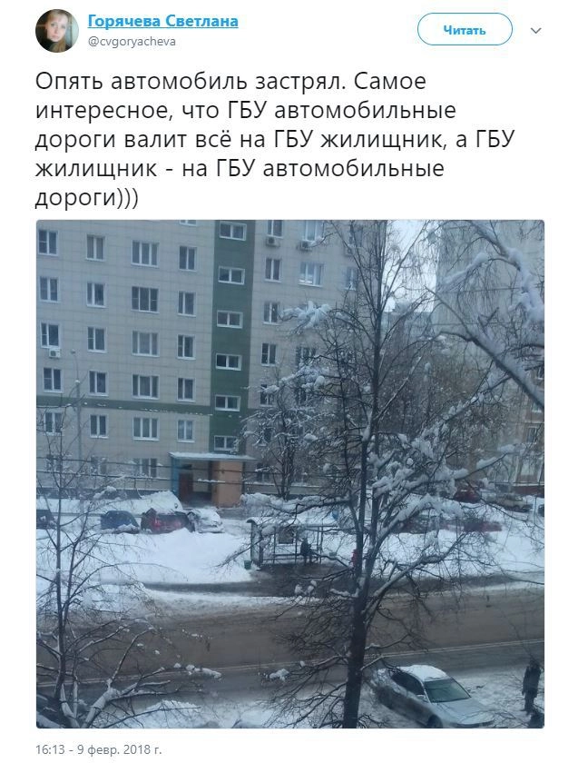 С 4 февраля, когда случился рекордный снегопад, соцсети завалило жалобами на работу коммунальных служб Москвы, в первую очередь ГБУ «Жилищник». Эта организация больше недели не может убрать снег даже на пороге своих офисов. Например, снегом завален весь двор дома 107А по улице Первомайской, где сидят сотрудники ГБУ «Жилищник района Восточное Измайлово».