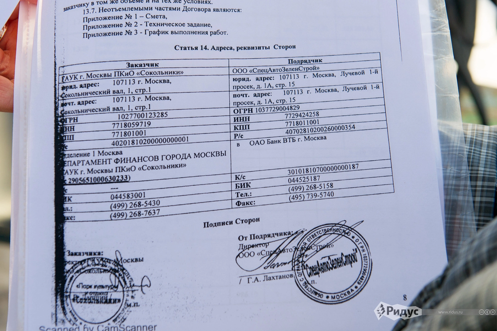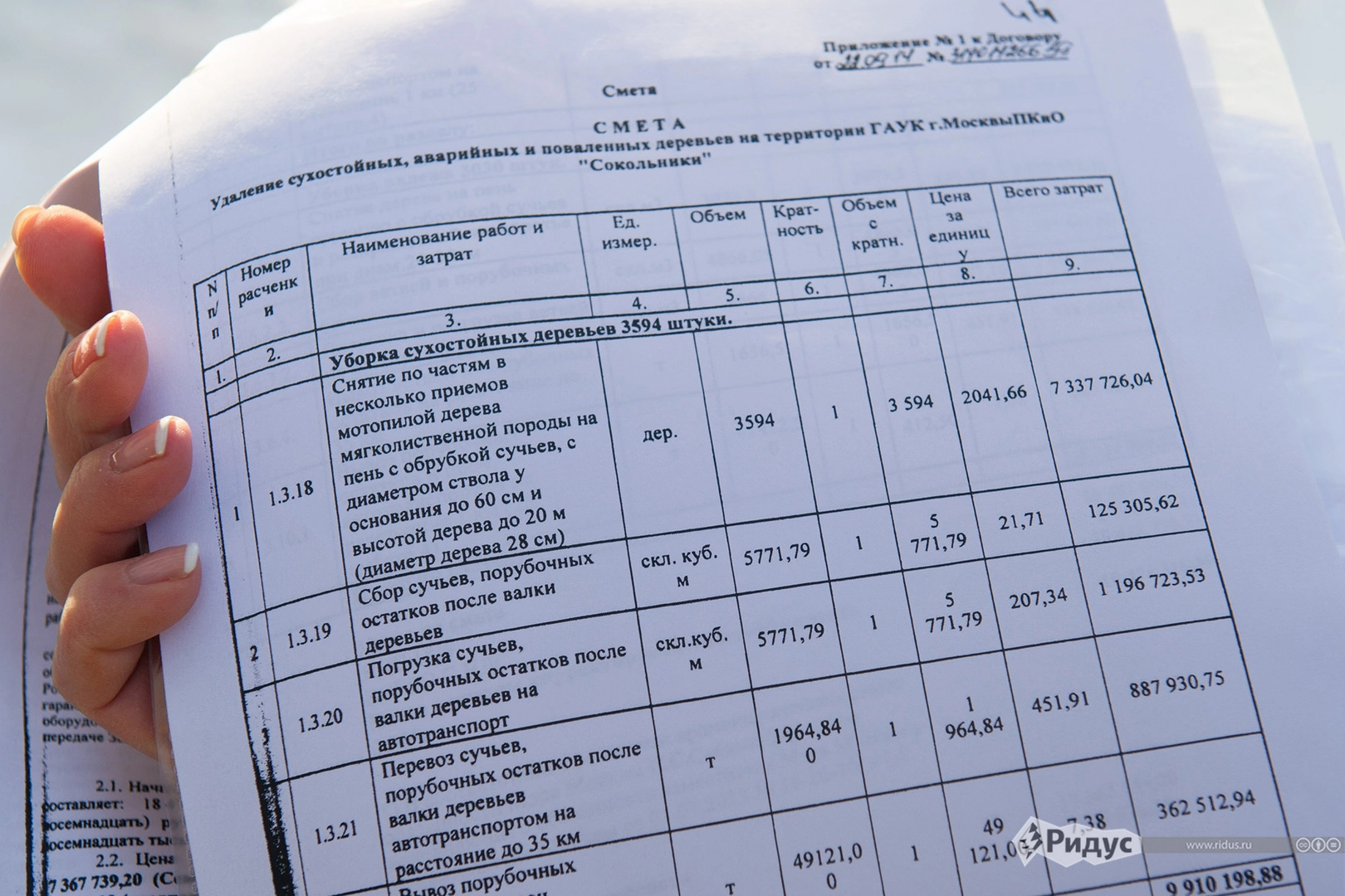 Работы по вырубке деревьев в «Сокольниках» проводила организация «СпецАвтоЗеленСтрой». За это правительство Москвы выложило 18 миллионов рублей. Согласно смете, снятие деревьев по частям в несколько приемов стоило 7 миллионов 337 тысяч рублей. Подрядчик нанял за 13 с половиной тысяч рублей гастарбайтеров, даже не имевших разрешения на работу в России, и выдал им просто бензопилу. Обязательная в таких случаях технологическая карта, без которой подобные работы проводить нельзя, датирована 2013 годом, хотя договор был заключен в 2014 году.