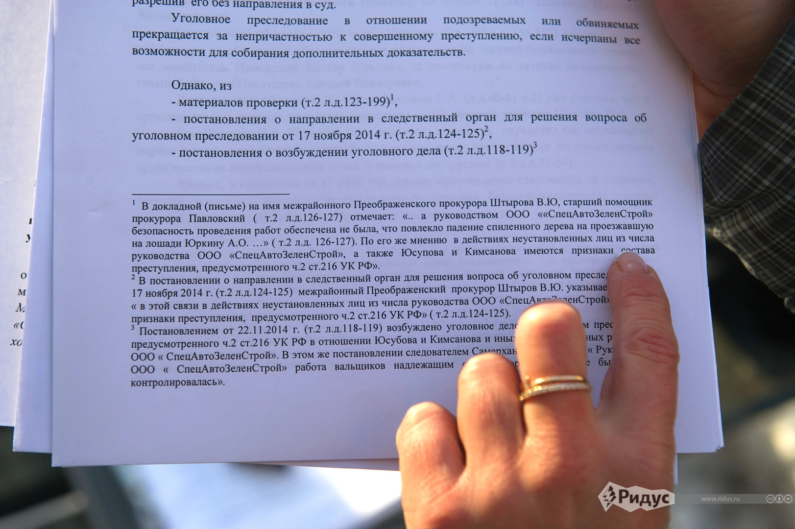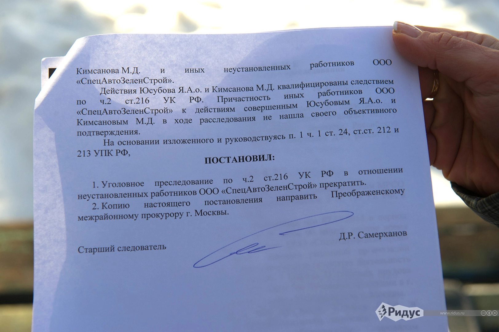 Следствие признало гастарбайтеров виновными и передало дело в суд. О том, кто их нанял и допустил до работы, в материалах ничего не сказано. Хотя старший помощник прокурора Павловский в докладной записке следователю написал, что в «действиях неустановленных лиц из числа ООО „СпецАвтоЗеленСтрой“ имеются признаки состава преступления, предусмотренного ч. 2 ст. 216 УК РФ» (Нарушение правил безопасности при ведении горных, строительных или иных работ, повлекшее по неосторожности смерть человека).