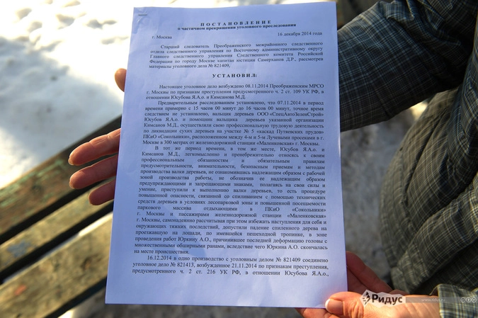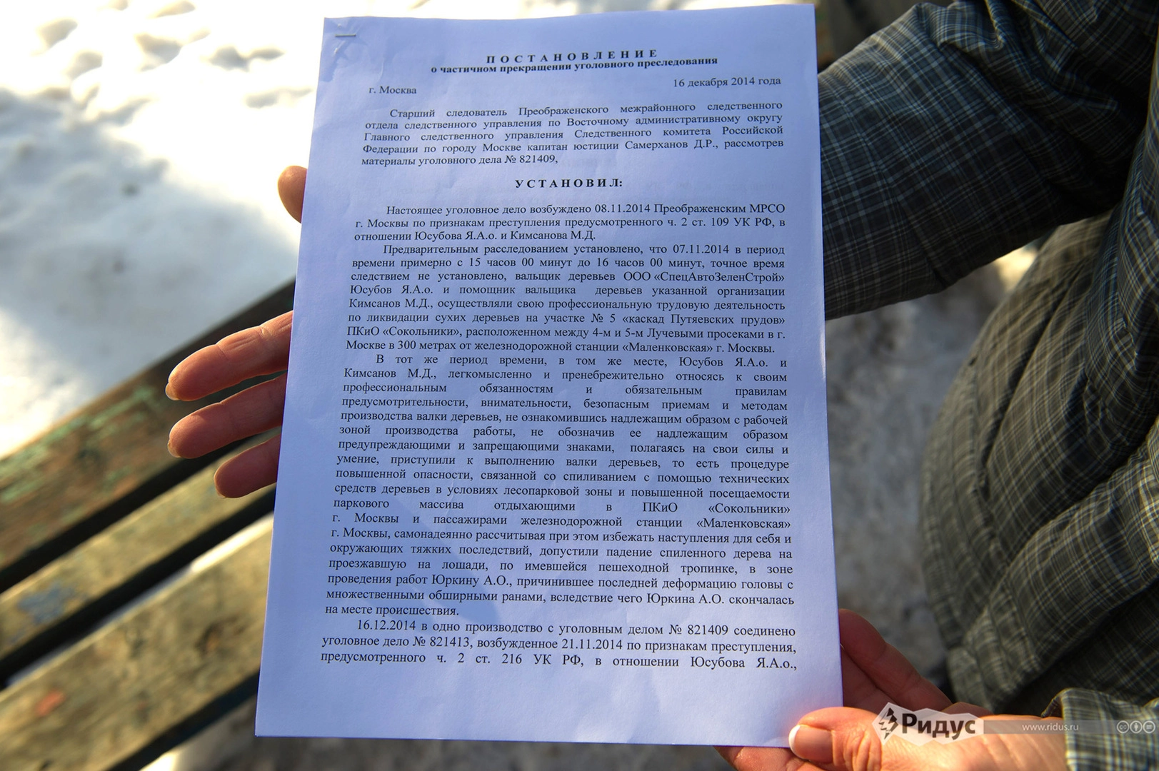 В деле о гибели Александры Юркиной их фамилии не фигурируют. Получается, что рабочие по собственной инициативе взяли и спилили дерево в «Сокольниках». На жалобу от 29 декабря о том, что следствие не привлекает к ответственности должностных лиц, ответа до сих пор нет. Такое положение вещей Ирина Жукова — адвокат Татьяны Шамановой — называет процессуальным нонсенсом.