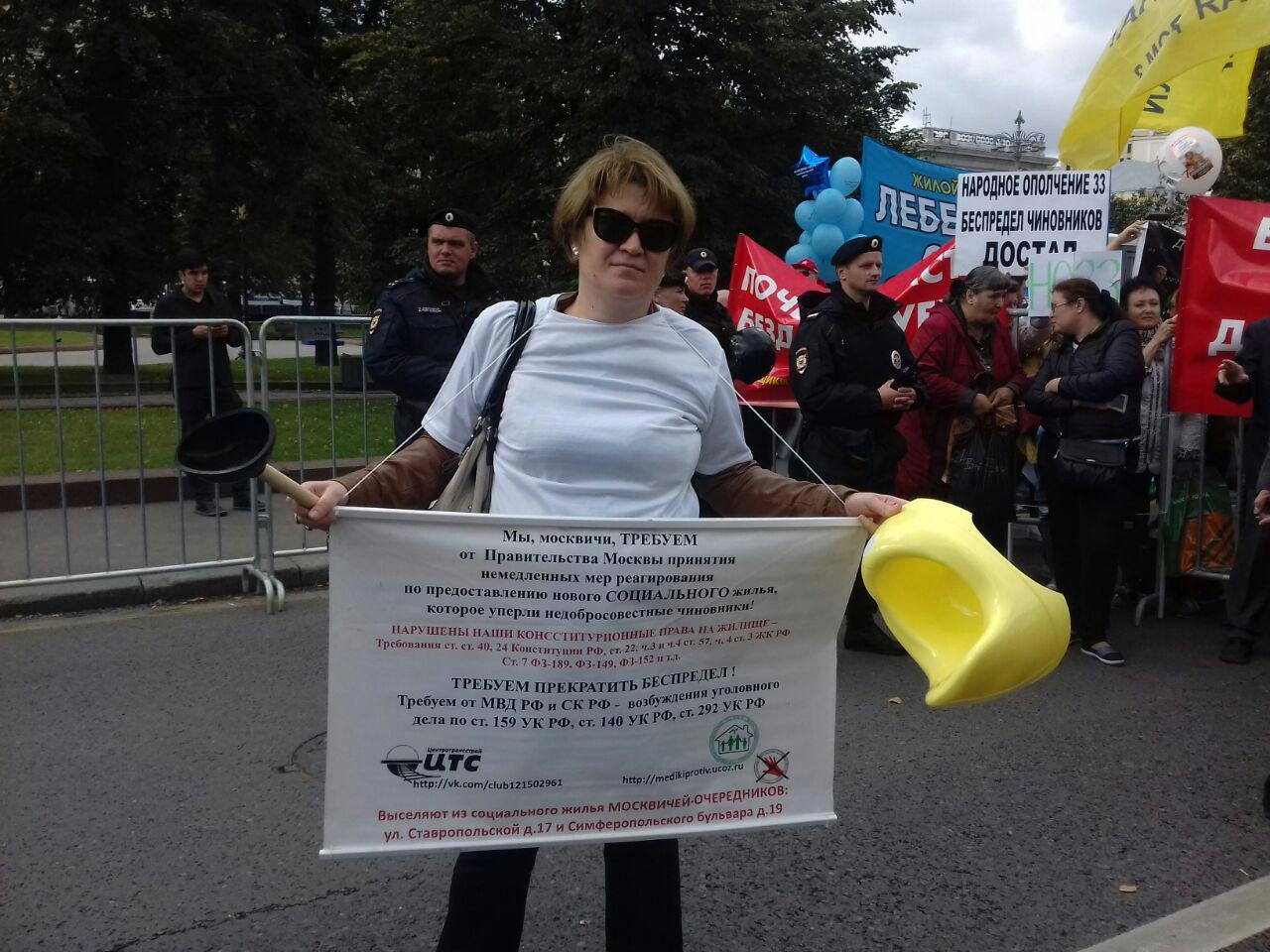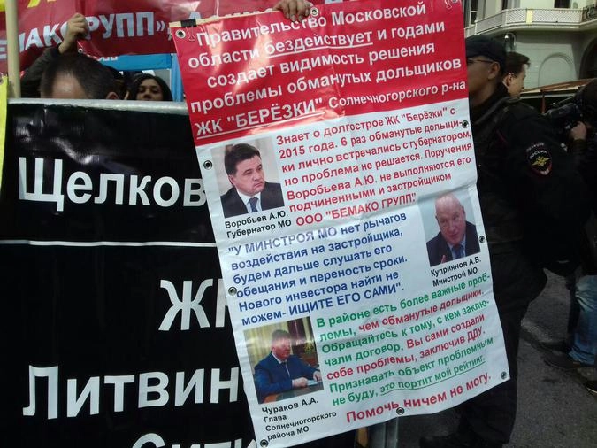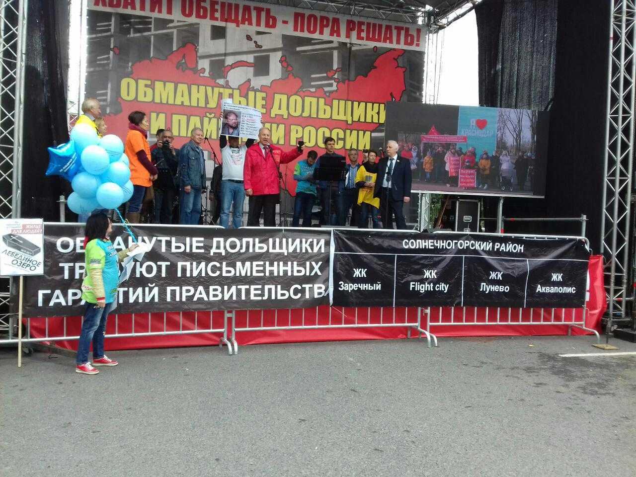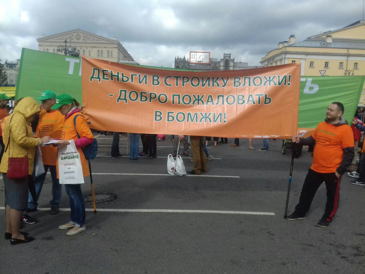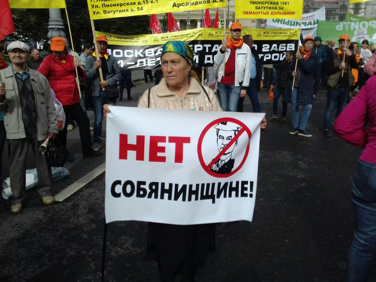 На Всероссийском митинге обманутых дольщиков 16 сентября лозунги, звучащие от столичных активистов, стали заметно агрессивнее: «Беспредел чиновников достал», «Мошенники жируют, наши дети бомжужют», «Нет собянинщине», «Мы жертвы воровства, безнаказанности и беззакония в Пушкино».