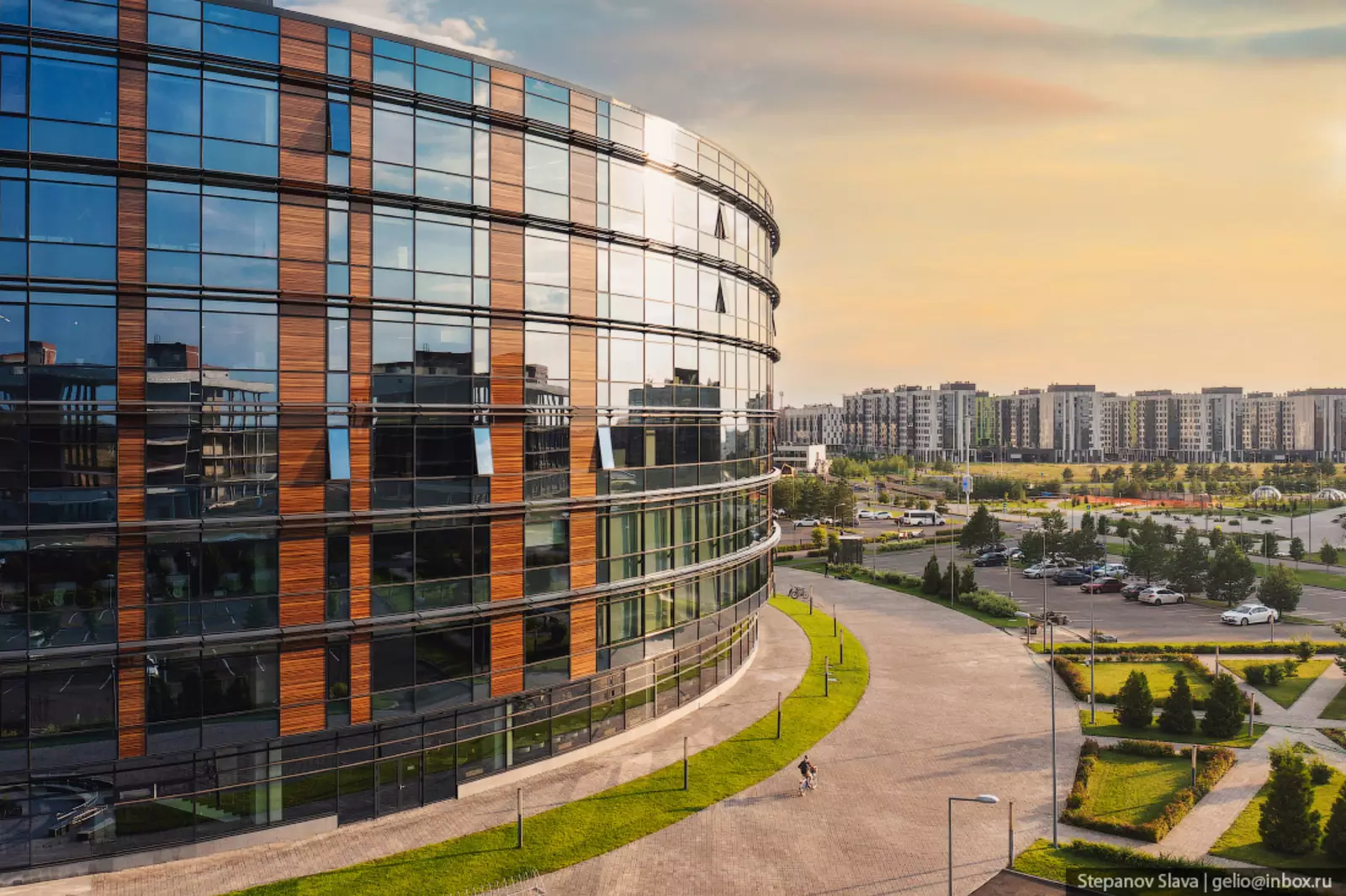3. Технопарк выполнен в виде кольца с внутренним двориком. Вокруг скверы, парковочные места. Говорят, что сотрудники здесь увлечённые и задерживаются на работе до поздней ночи.