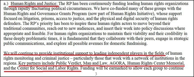 Среди ключевых партнёров в России фонд Сороса указывает «Общественный вердикт», «Человек и закон», «Агора», «Мемориал» и «Центр социальных и трудовых прав».