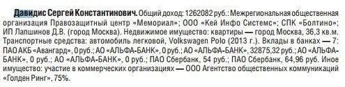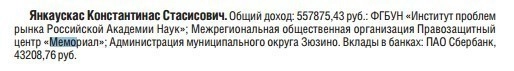 Правозащитный центр «Мемориал» существует в основном за счет финансирования из-за рубежа. В связи с этим весьма странным выглядит то, что целый ряд российских оппозиционеров при выдвижении на выборы в Госдуму указали организацию как основной источник дохода — это правозащитница Светлана Ганнушкина, а также соратники главы ФБК Алексея Навального — Константин Янкаускас и Сергей Давидис.