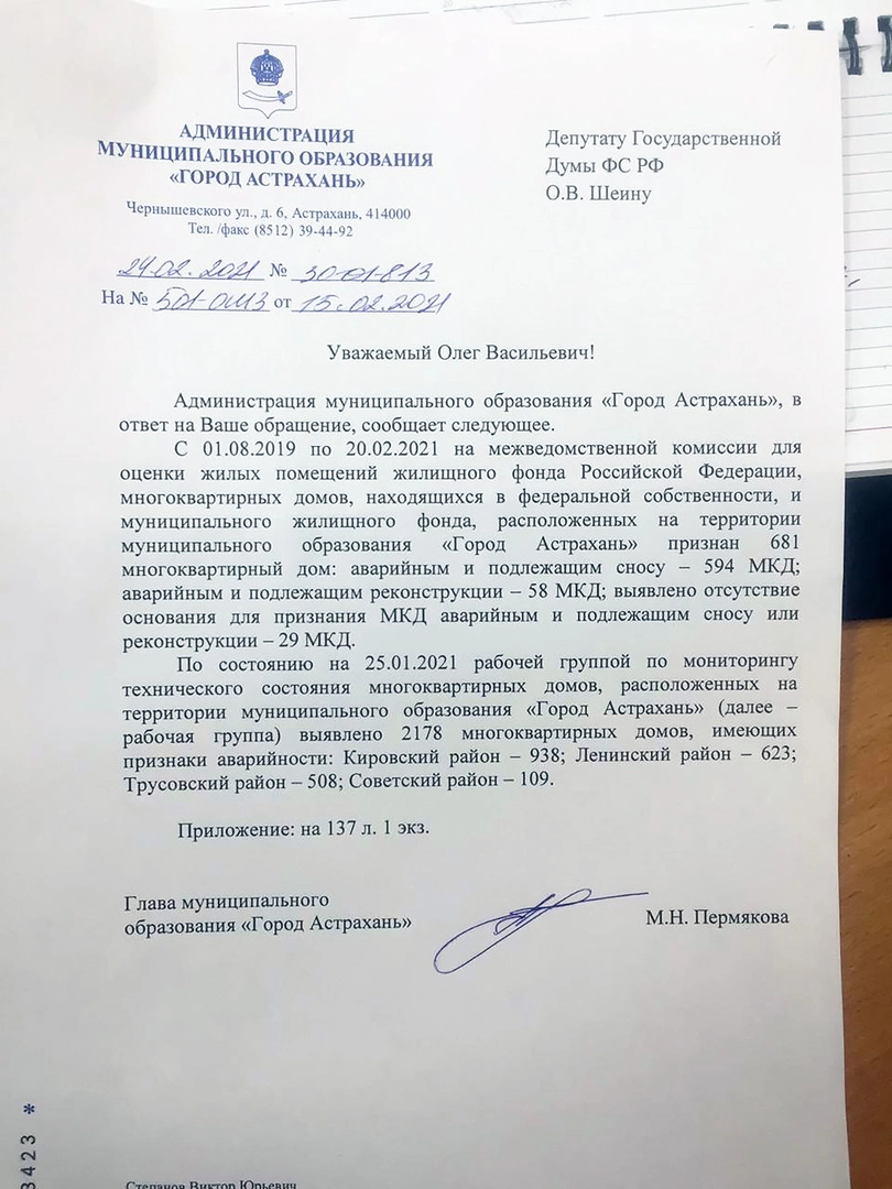 Тем временем депутат Госдумы от «Справедливой России — За правду» Олег Шеин публикует в соцсетях письмо, подписанное главой города, в котором говорится, что указанные дома все же рекомендованы к сносу.
