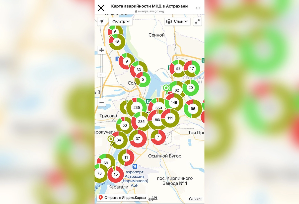 На карте красным цветом помечено то, что точно подлежит сносу, по мнению администрации города. Коричневым — что подлежит реконструкции. Зеленым — что рекомендовано к сносу. Салатовым — что имеет признаки аварийности.
