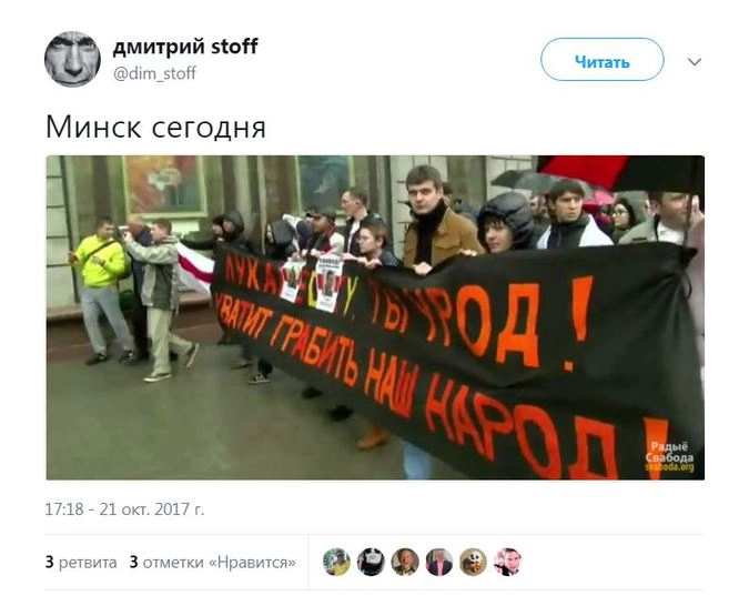 Напомним, в марте этого года в Минске и других крупных городах Белоруссии под лозунгами «Мы не рабы» и «Мы не дармаеды» прошли уличные акции оппозиции за отставку руководства страны. Они завершились массовыми задержаниями. Сходство с поведением участников киевского Евромайдана в 2014 году было заметно невооруженным глазом, однако сотрудники правоохранительных органов продемонстрировали хорошую подготовку и готовность использовать спецсредства.