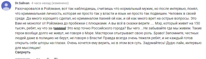 Нападки Дудя на собеседника и откровения политика разделили пользователей Сети на два лагеря. Одним Ройзман показался лживым актером, другие сетовали на «желтизну» вопросов интервьюера.