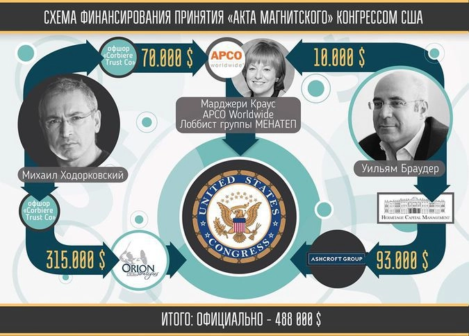 В материале «Ложь Ходорковского и сколько он заплатил конгрессу США за Акт Магнитского. Новые факты», опубликованном на Фейсбуке, говорится о финансовых структурах, с помощью которых олигарх финансировал продвижение уже принятого «Акта Магнитского».