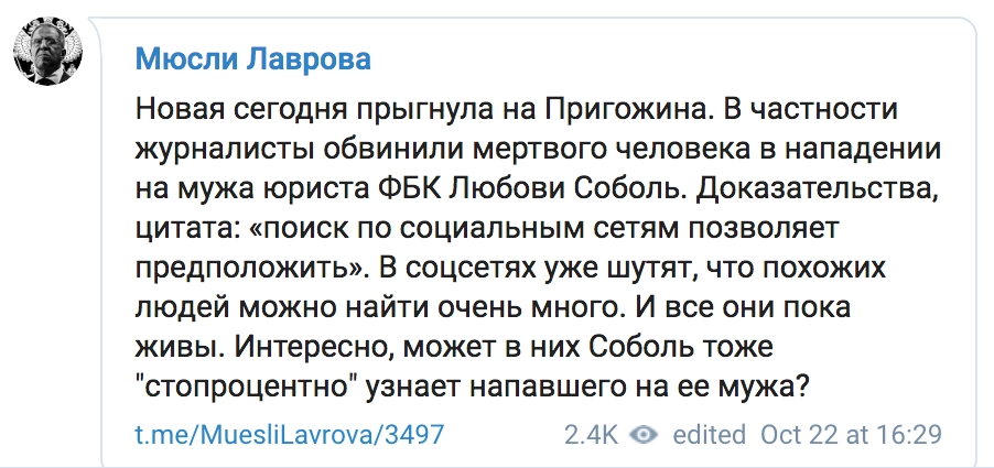 Телеграм-канал «Мюсли Лаврова», пользуясь методом «Новой газеты», нашел в социальных медиа еще десяток таких-же «подозреваемых» — от кинооператоров до продавцов внутренних органов: