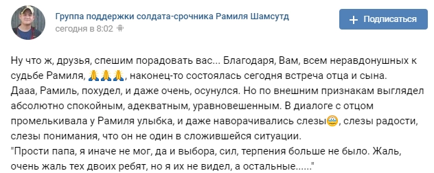 6 ноября сообщество опубликовало рассказ о встрече Рамиля с его отцом Салимом Шамсутдиновым и приводит слова, которые он сказал родителю о трагических событиях 25 октября.