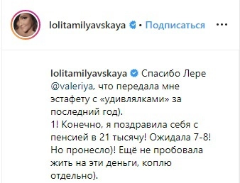 Лолита Милявская узнала размер своей пенсии по старости, которую артистке никак не могли рассчитать с ноября прошлого года. Ей начислены выплаты по 21 тысяче рублей в месяц, о чем певица и сообщила в своем Instagram.