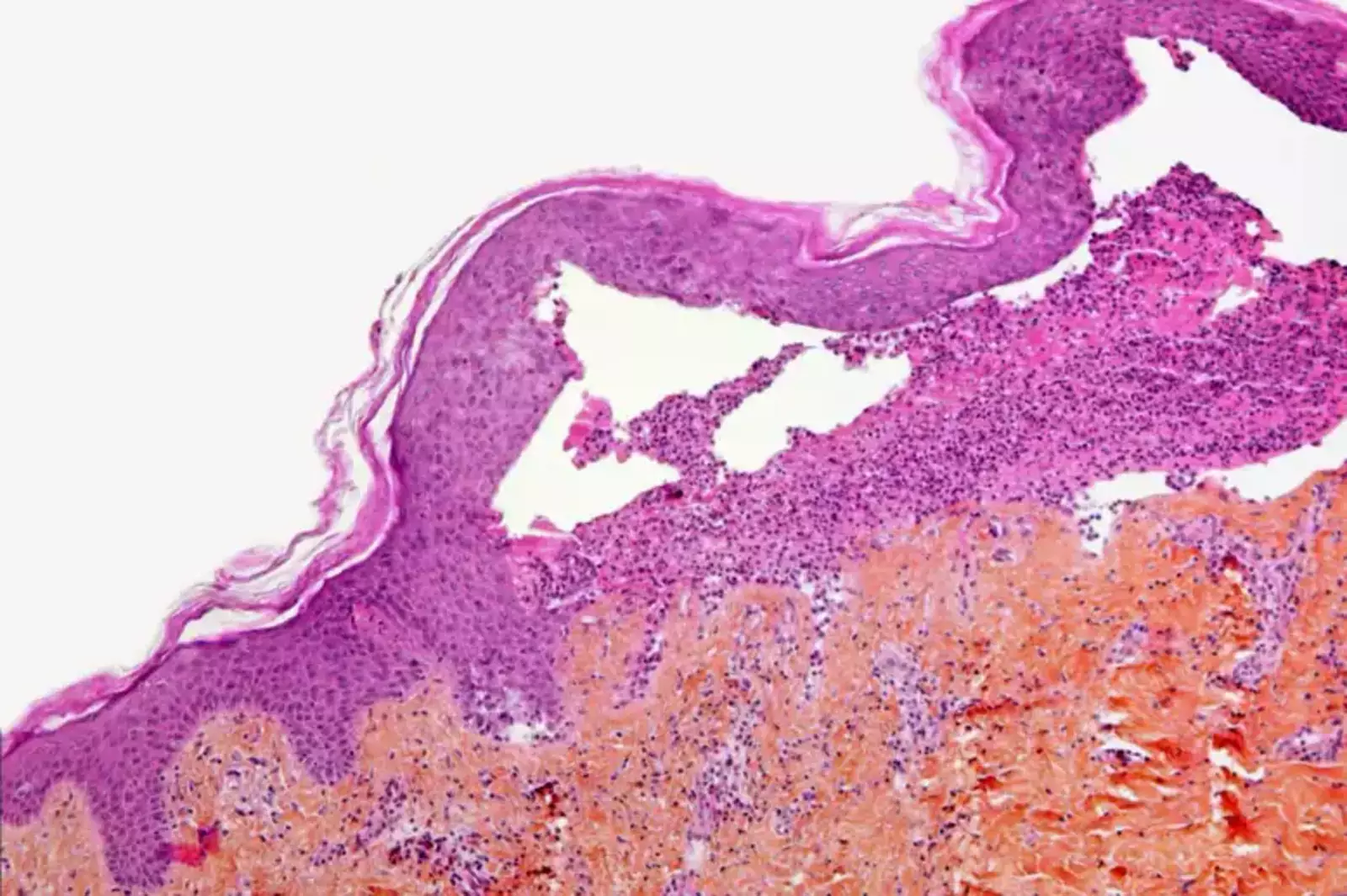 Образец кожи человека с буллезным эпидермолизом. Два слоя кожи, эпидермис и дерма, разделились, потому что между ними нет коллагена.