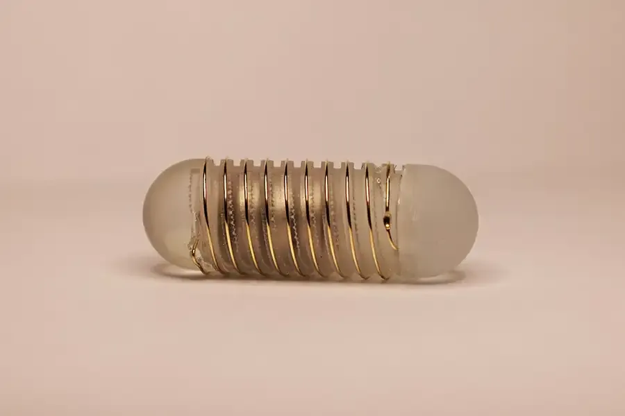 Необычную капсулу размером с изюмину разработал Массачусетский технологический институт (США). Внутри таблетки находится маленькая батарея, которая генерирует электрический ток, пробегающий по золотой проволоке, намотанной снаружи. Канавки, выгравированные на поверхности капсулы, отводят жидкость, поэтому проволока может электрически стимулировать рецепторы в желудке, которые высвобождают грелин.