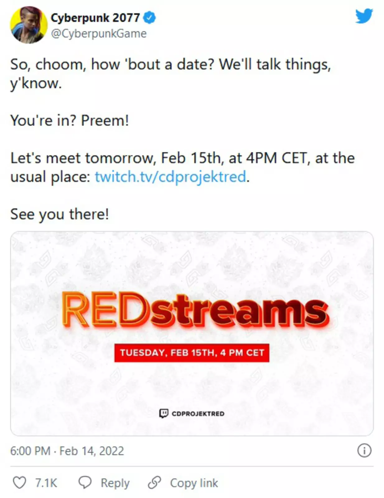 Поэтому сегодня разработчики объявили о трансляции, которая расскажет о дальнейших улучшениях Cyberpunk 2077 в 2022 году.