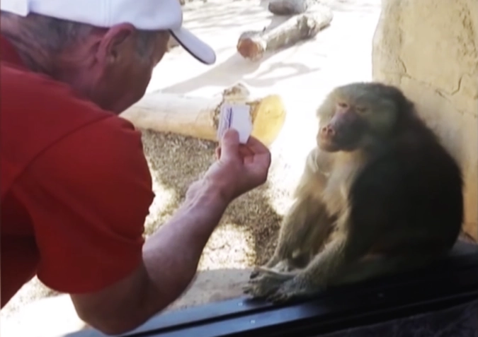 В Сети набирает популярность ролик, на котором человек в зоопарке показал обезьяне фокусы с картой.