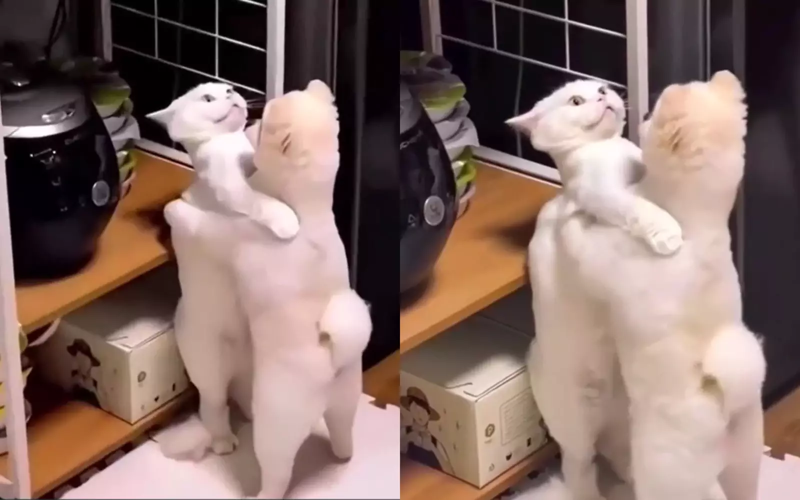 В отличие от собак, большинство кошек не любят неожиданных обнимашек. Котейка из этого видео тоже не относится к любителям телячьих нежностей, но собакена, который решил крепко ее обнять, это совершенно не волновало. Поэтому он обхватил хвостатую подругу лапами и стоял с ней в обнимку, не обращая внимания на ее шокированную мордаху.