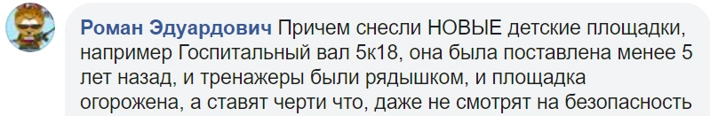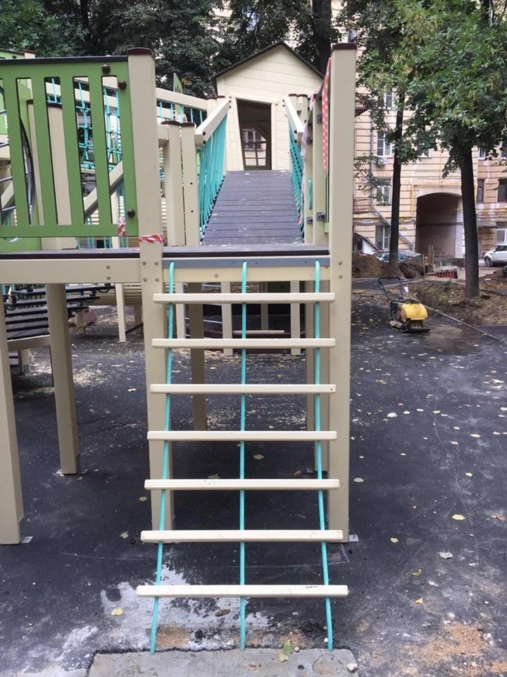 «Ридус» также пообщался с москвичкой Татьяной, десятилетний внук которой упал на детской площадке в Басманном районе, где как раз проходят работы по благоустройству. Как говорит женщина, инцидент произошел третьего августа во дворе дома №5, корпус 18, по улице Госпитальный вал: здесь на детской площадке была недостроенная конструкция. Сооружение представляет собой горку высотой два метра, а перед ней — небольшая площадка, с которой на асфальт спущена веревочная лестница.