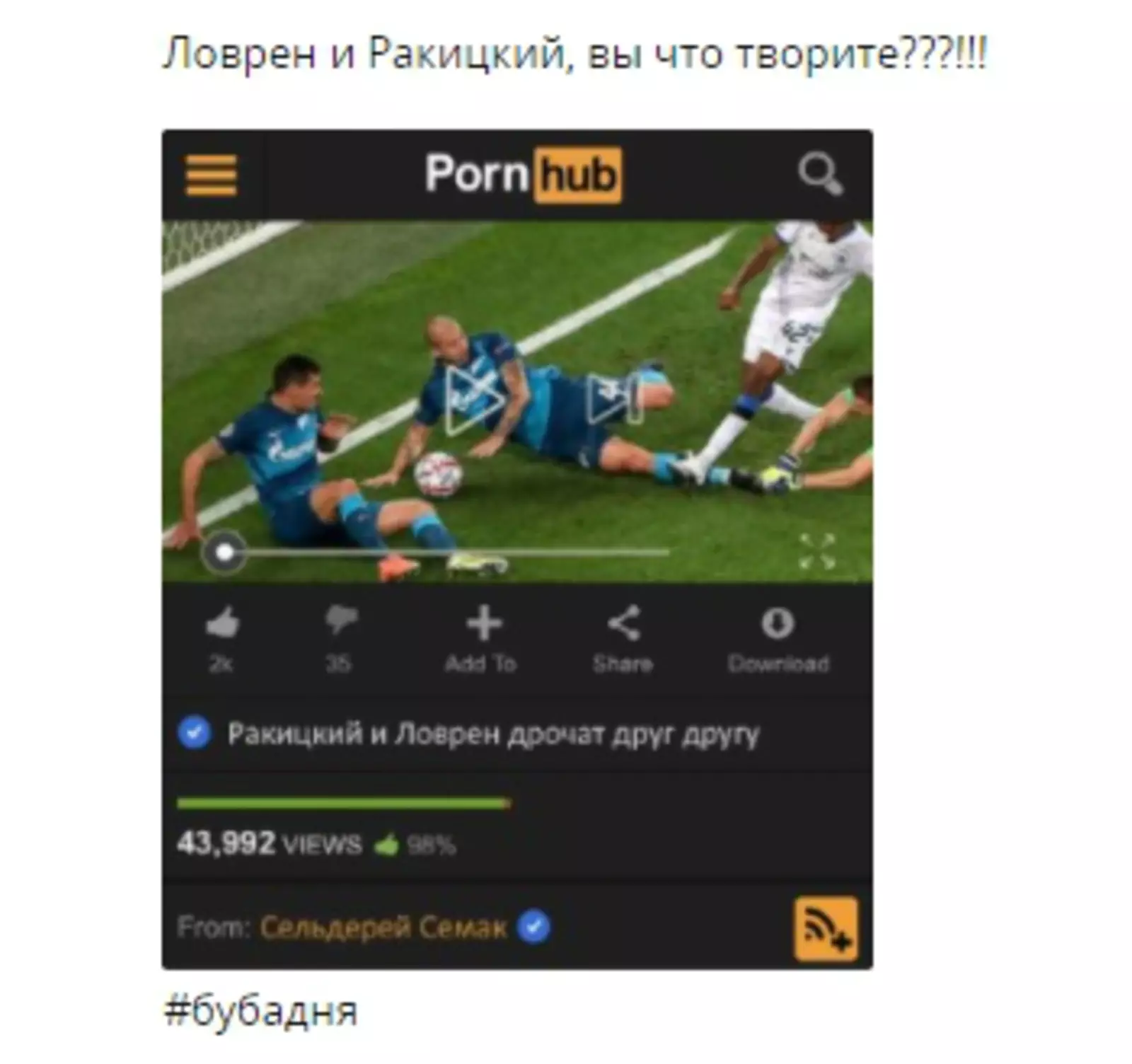 В соцсетях сообщалось, что в текстовой трансляции игры на сайте после первого пропущенного «зенитовцами» гола появился комментарий: «Там Ловрен и Ракицкий дрочат друг другу». Позднее непристойный текст был удален, но скриншоты с ним распространились по Рунету, а описание неудачи двух игроков «Зенита» стало мемом.