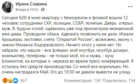 Проводили обыск. Адвокату позвонить не дали. Искали брошюры, листовки, счета «Открытой России», возможно, икону с ликом Михаила Ходорковского. Ничего этого у меня нет. Но забрали, что нашли — все флешки, мой ноутбук, ноутбук дочери, компьютер, телефоны (не только мой, но и мужа), кучу моих блокнотов, — так описала обыск Ирина Славина.