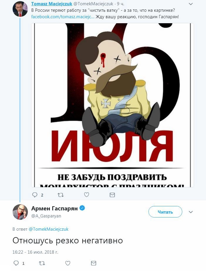 «Давайте петицию составим в адрес Первого канала. Такие люди не должны работать на главном канале страны», — предложили к комментариях у Мацейчука. После этого комментарий Ермакова оказался удален. Возможно, это произошло потому, что его осудили даже идейно близкие единомышленники.