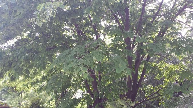 Дерево можно увидеть рядом с не менее пышно цветущей Робинией лжеакациевой у Зеркального канала сада.