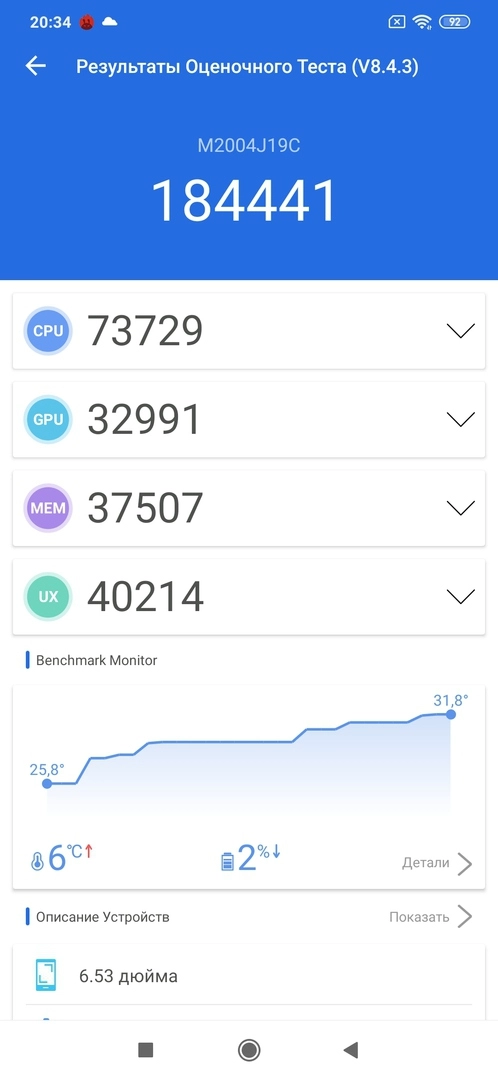 MediaTek Helio G80 достаточно производительный чип — в тесте Antutu он набирает 184 441 балл, что очень хороший результат для бюджетника. Но все же не стоит забывать, что это очень недорогое устройство, поэтому запуск приложений здесь не такой быстрый, как у флагманов, и иногда можно заметить подтормаживания и фризы. Однако в целом производительность смартфона на достаточно высоком уровне, поскольку основные конкуренты оснащаются куда более слабыми процессорами и работают значительно медленнее.