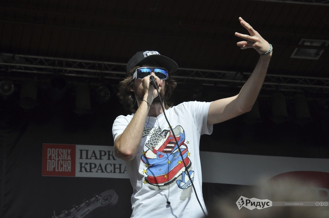 Выходит бодрый и обросший Noize MC, который пришел сюда с женой и сыновьми и у которого тема детства в творчестве — отдельная («Ругань из-за стены», «Жадина» — песня, по его словам, единственно подходящая для этого праздника), и мгновенно собирает у сцены не один десяток вдруг откуда-то взявшихся подростков.
